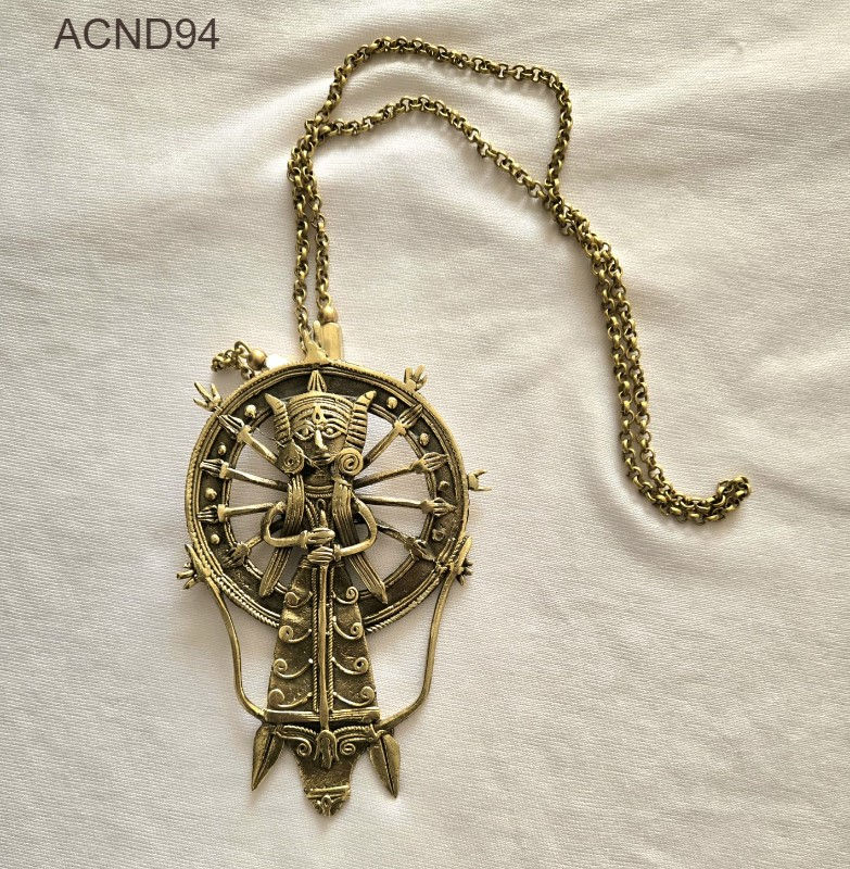 Accessory: Dokra necklace with triangular pendant on metallic chain