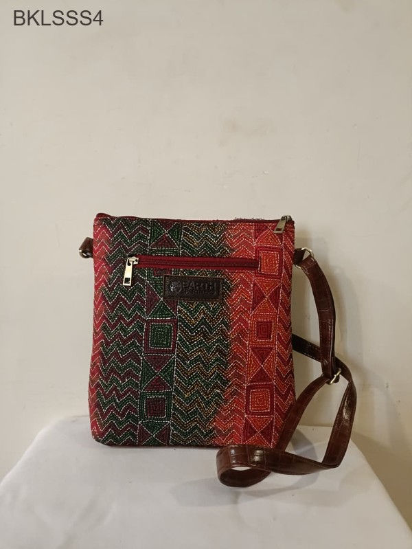 Bag: Kantha-leatherite shoulder-sling bag with sitalpati accent